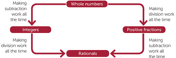 School mathematics normally follows the historical development of numbers and introduces students first to whole numbers then to positive fractions, then to integers,