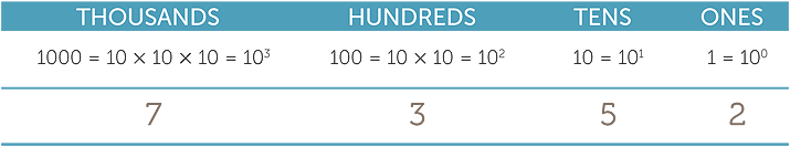 This means 7 × 1000 + 3 × 100 + 5 × 10 + 2.
