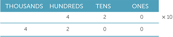 Multiplying a number by ten shifts each digit one place to the left. Because there is now nothing in the ones column, we put a 0 in that column as a place holder. The following table illustrates the process for 420 × 10 = 4200.