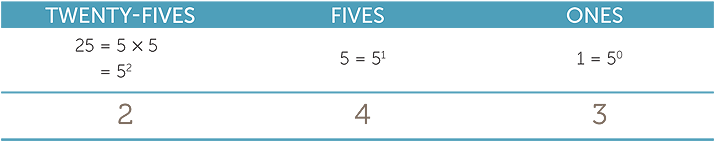 What happens if we use five instead of ten as the base for the columns? Working in base five the column headings would be powers of five. For example, in base 5, 243 is shown as